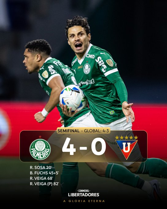 Com uma atuação de gala, o Palmeiras goleou a LDU (Equador) pelo placar de 4 a 0, na noite desta quinta-feira (30) no Allianz Parque, e garantiu a classificação para a decisão da Copa Libertadores da América, onde encontrará o Flamengo, que, na última quarta-feira (29), segurou um empate com o Racing (Argentina) para chegar à final da competição continental.